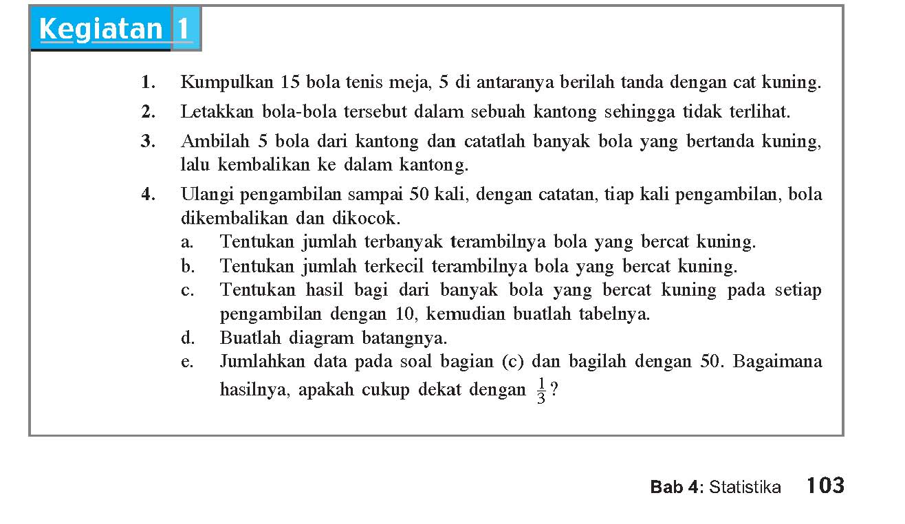 Kalau ini tidak memberikan penjelasan tentang banyaknya bola kuning, kita dapat meminta setiap siswa untuk sekali lagi mengambil satu bola dan mengembalikan lagi. Sehingga kita memperoleh 80 data.